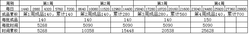 题目要求前4周每一周有140个成品,前四周不少于680个。这个需要验算一下,每周均有140个成品,4周成品700个。比如在第三周时,第三批的完成时间15448和第四批的完成时间20538都包含在第三周内,那么第三周的完成数量就是280个(如表6-25所示)。
