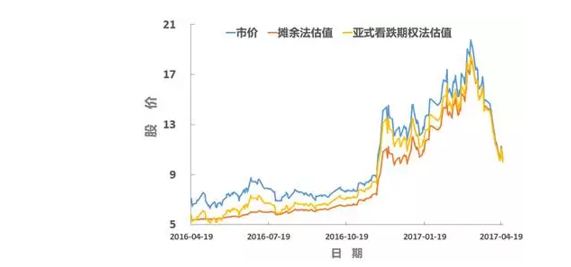 测算表明,在流通受限期开始时(2016年4月19日附近),由于离解禁到期时间较长,预期年化波动率较大等原因,亚式看跌期权法估值一度小于摊余法估值。而在2016年11月底时,亚式看跌期权法估值已经无限趋近于市价,远高于摊余法估值。在流通受限期结束时(2017年4月21日附近),摊余法估值、亚式看跌期权法估值均无限趋近于股票本身的公允市价。