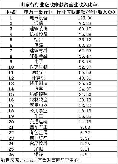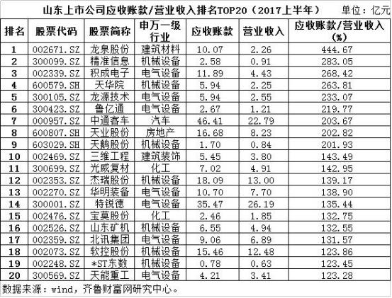 具体分析山东上市公司的情况,截至9月19日,wind资讯统计的190家山东上市公司(含2家B股公司),上半年应收账款占营业收入的比率在50%以上的75家,占比39.47%,其中31家比值在100%以上,排名榜首的龙泉股份(002671)更是高达444.67%。