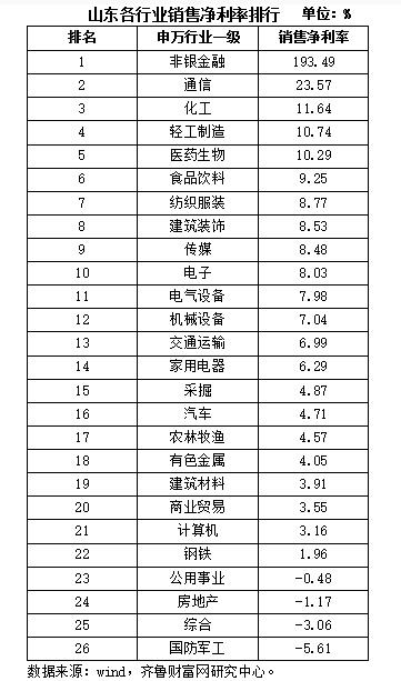 从山东涉及的26个申万一级行业分析,有13个行业高出全省水平,另有4个行业受到净利润数值的影响,销售净利率显示为负。各行业中,非银金融销售净利率最高,达到193.49%,分析其原因发现,所属非银金融行业的有2家上市公司,分别为民生控股(000416)以及鲁信创投(600783),对应的销售净利率分别为393.72%,185.74%。对应中报显示,民生控股(000416)利息收入达到3174.45万元,鲁信创投(600783)投资收益达2.03亿元,从而带动净利润指标。