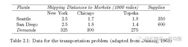 作为运输问题的例子,假设有两个罐头厂和三个市场,已知数据如表 2.1 所示。运输距离的单位是千英里,运输成本是$90.00 每箱每千英里。这个例子的 GAMS 表述是: