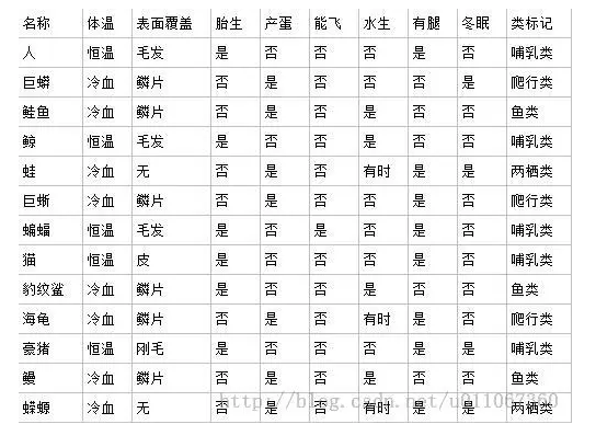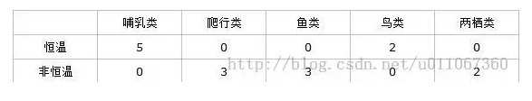 假如在构造分类回归树的第一步我们得到的“分类条件”是:体温为恒温和非恒温。此时: