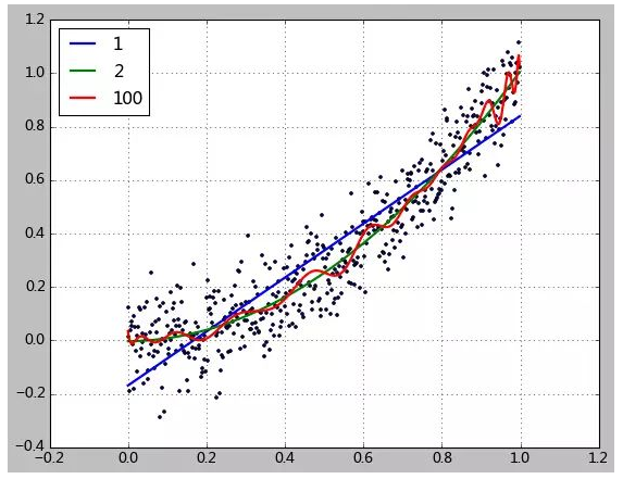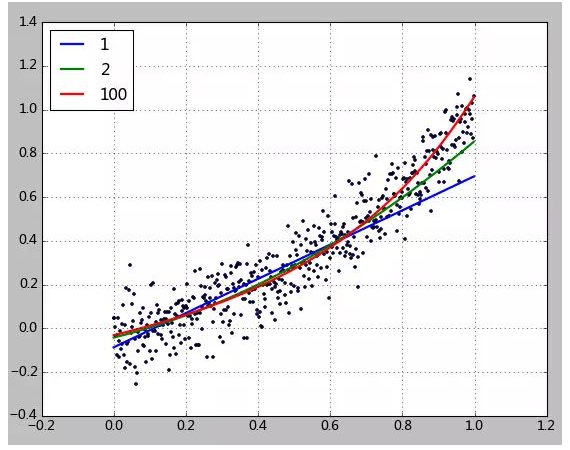 本例中使用一个2次函数加上随机的扰动来生成500个点,然后尝试用1、2、100次方的多项式对该数据进行拟合。