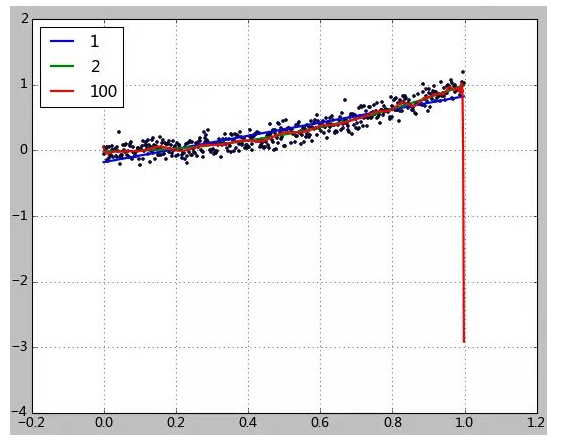 使用100次方多项式做拟合,效果确实是高了一些,然而该模型的据测能力却极其差劲。