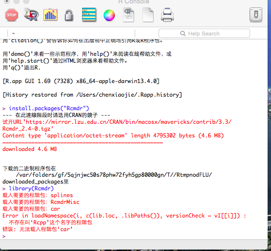 Mac上的的r是3.3.3版本的,安装了Rcmdr和ggplot2,然而却运行失败,总是显示图片的情况,不知道问题到底出在哪呢?麻烦各位了。。。