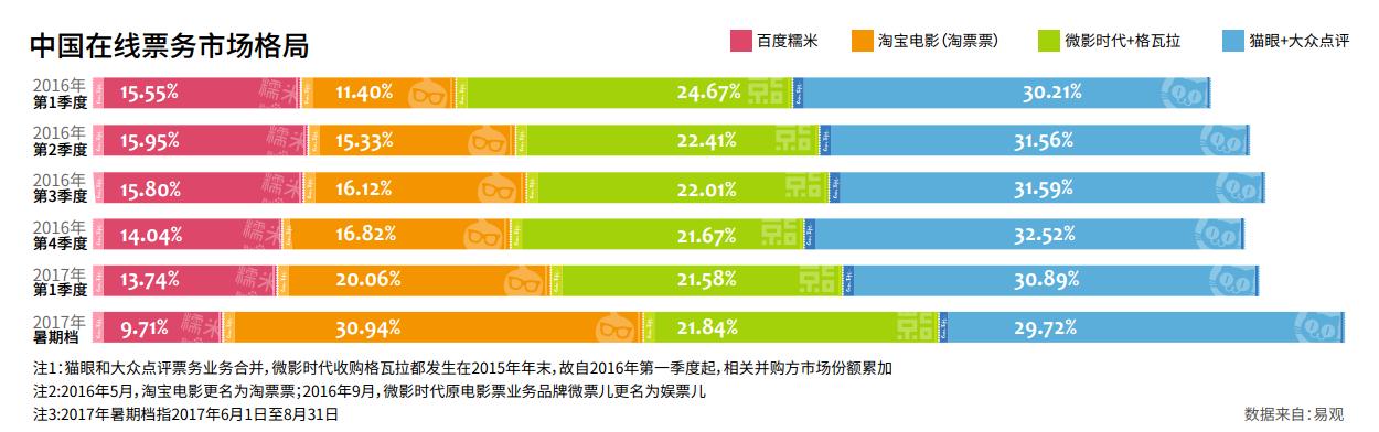 到2016年一季度,市场格局初定:据易观数据统计,猫眼与大众点评合计包揽30%以上市场份额;微影时代与格瓦拉则拿下20%以上份额;行业排名第三的是当时号称手握百度200亿元补贴的百度糯米;淘宝电影(后更名淘票票)当时市场份额在10%左右。
