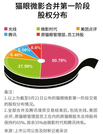 王长田进一步透露,猫眼和微影的合并交易全部结束后,包括光线、美团点评、管理层等在内的原猫眼股东总持股约65%,其余35%由微影时代和腾讯持有。