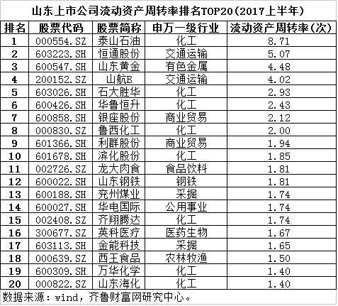 根据wind资讯统计,截至9月25日,山东190家上市公司(含2家B股公司),剔除数据不全的英派斯(002899)后流动资产周转率在1次以上的39家,其余150家上市公司周转次数在0-1(不含)次之间。其中,泰山石油(000554)上半年流动资产利用效率最高,为8.71次。