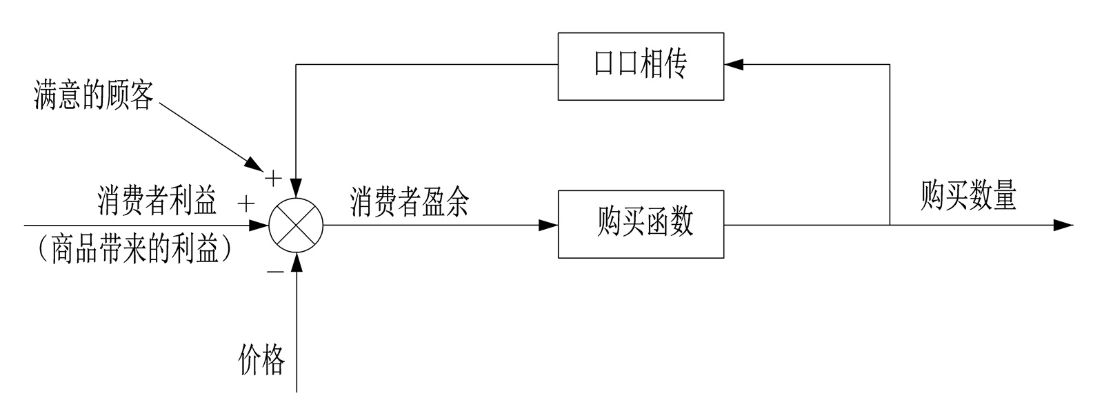 在控制理论中,分为开环控制系统和闭环控制系统。开环控制系统是不将控制的结果反馈回来影响当前控制的系统。闭环控制系统是将控制的结果反馈回来影响当前控制的系统。简单的说就是系统不加入反馈环节,就叫开环系统;系统加入反馈环节,就叫闭环系统。在系统思考中介绍了两种基本的闭环控制系统,它们分别是负反馈系统和正反馈系统。以系统思考的这两种基本模型来分析《第五项修炼》中的例子。在口口相传的正反馈示意图中,消费者利益是商品给消费者带来的利益,是购买的动力,价格是购买的阻力,二者的合外力决定了销售量。当购买到商品的顾客对商品很满意,他们互相转告,口口相传,增加了消费者盈余,使购买量增加,而购买量增加又增加了满意的顾客数量,进而增加了口口相传,又增加了消费者盈余,进而又促使购买量增加,从而形成了正反馈效应(如图7-5所示)。