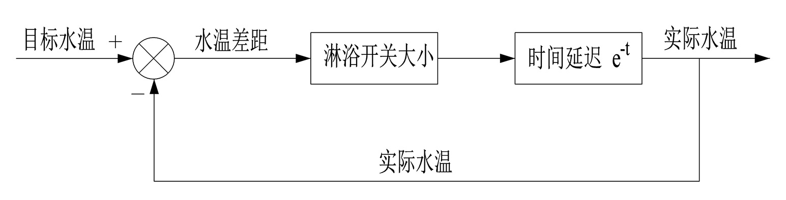 在淋浴水温的负反馈中,目标水温是要达到的目标,而实际水温和目标水温相同是要得到的结果,通过调节淋浴开关大小来增加或者降低水温,使得水温偏差为0,即达到了目标。水温偏差=目标水温-实际水温,当目标水温大于实际水温时,水温偏差为正,通过调大淋浴开关可以使实际水温增加,进而减少水温偏差,直至偏差为0;当目标水温小于实际水温时,水温偏差为负,通过调小淋浴开关可以使实际水温减少,进而减少水温偏差,直至偏差为0,最终达到均衡的结果,实际水温和目标水温相同。当调节淋浴开关后,水温不会立即达到目标值,水温会慢慢的上升或下降,而这段时间就是时间延迟,在控制理论中叫做时滞,用e-t表示。任何环节都存在时滞,即使在原子弹的爆炸中,能量的积累到爆炸也是需要时间的(如图7-7所示)。