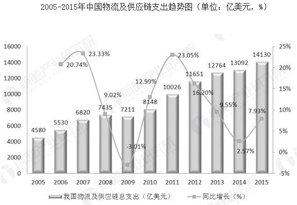 2015年,我国物流及供应链相关的总支出约14130亿美金,物流及供应链成本占GDP的比重为15%左右,市场的潜力很大。70%的物流及供应链外包服务提供商在过去的几年中,年均业务增幅都高于10%。
