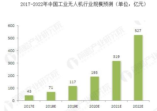 总的来说,随着我国工业无人机政策的落地,工业无人机行业野蛮生长的态势将被遏制,而进入到健康生长模式的工业无人机产业将迎来黄金的发展时期,尤其是开发仍在深入的工业无人机领域,将迎来行业规模的大爆发。未来,工业无人机行业增长速度仍将保持在高位,到2022年,行业规模将达到527亿元,平均增速将在65%左右。