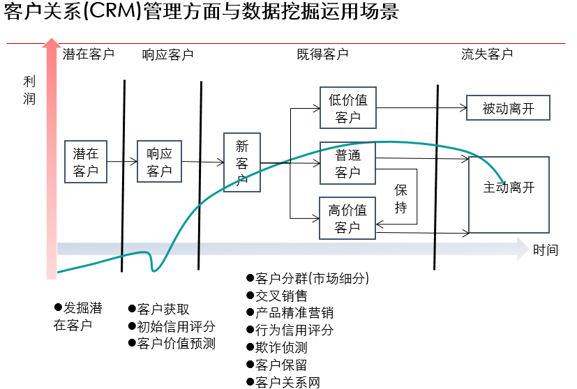 如客户生命周期管理、客户画像和客户分群、客户价值预测模型构建、推荐系统设计等。这些需要依托于不同行业。下图位CRM管理运用场景示例: