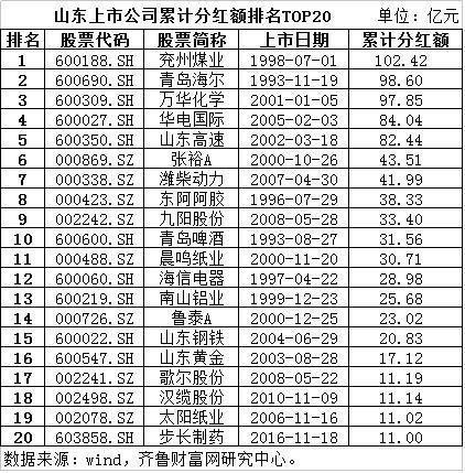 那么,山东上市公司的分红情况如何?有多少公司慷慨大方?又有多少公司是“铁公鸡”呢?齐鲁财富网研究中心统计wind资讯数据后对山东上市公司累计分红情况进行了排名,需要说明的是,本次统计样本为2017年6月30日之前上市的山东183家上市公司(含2家B股公司)。