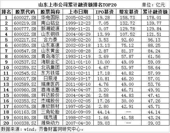 山东上市公司累计融资额排名TOP20