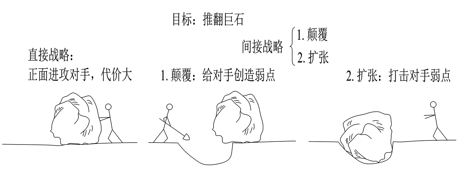 间接战略是1. 创造颠覆。给对手制造弱点。比如在巨石的背后先挖一个大坑,这样使石头容易丧失平衡。2. 扩张。打击对手的弱点,将石头推入挖好的大坑中,从而达到推翻巨石的目的。李德·哈特所强调的是使敌人丧失平衡,然后再进行打击。由于给敌人创造了弱点,并且打击了这个弱点,从而以较小的代价获得了更大的成果。