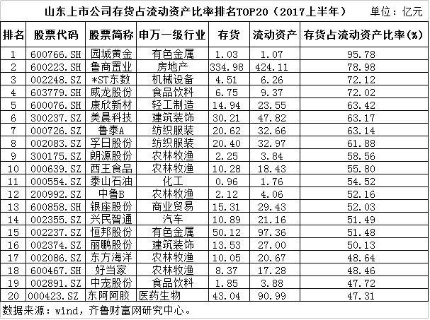 一般来说,存货占流动资产的比重过大,会造成资金的闲置和沉淀,影响资产的使用效率。根据wind资讯的统计,截至9月27日,山东191家上市公司(含2家B股公司),剔除中报数据不全的英派斯(002289)(2017年9月15日新上市),存货资产比率在30%以下的企业132家,占比69.47%;30%—50%之间的42家,占比22.11%;还有16家上市公司存货占流动资产的50%以上,园城黄金(600766)上半年末的存货余额竟占流动资产的95.78%,不止在山东排名第一,在全国也是“无人企及”。