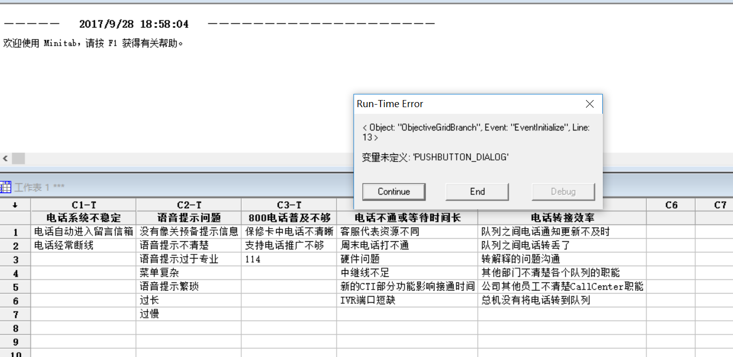 我想用minitab画鱼骨图,输入的内容如下,但老是显示“变量未定义PUSHBUTTON-DIALOG”,请问各位我该怎么办?