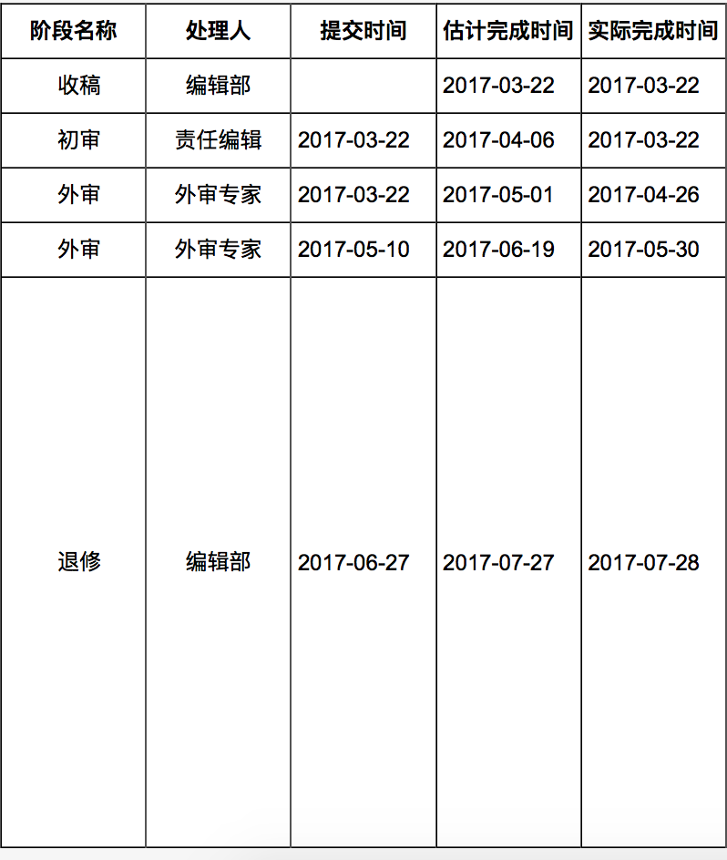 angelchenjiali 发表于 2017-10-5 09:14 我没有“审回”阶段,你是已经退修结束了还是还没有退修啊?贴个论文进程图?
