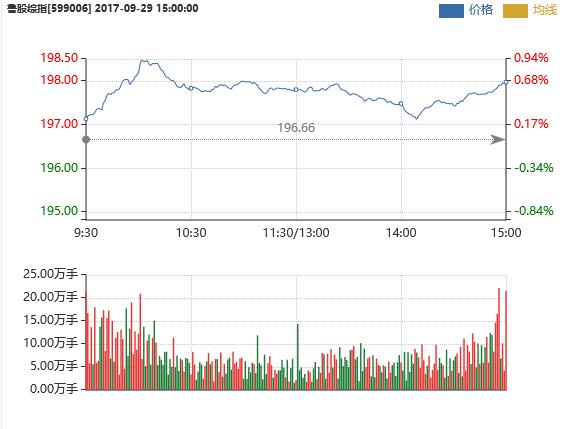 9月29日,两市小幅高开,午后,两市持续窄幅震荡。截至收盘,上证指数报3348.94点,上涨9.30点,涨幅为0.28%,成交金额达到1758.93亿元;深证成指报11087.19点,上涨55.77点,涨幅达0.51%,成交金额为2584.77亿元;创业板指报1866.98点,上涨12.25点,涨幅0.66%,成交金额767.12亿元。5G题材受关注,新能源汽车板块午后拉升,锂电池、次新股板块表现弱势。本周沪指小幅下跌,连跌4周;月线结束三连阳。板块方面贵金属、环保、精细化工等涨幅居前,酒类、软饮料、花费农药等领跌。个股方面来看,29日有3股上市,分别为铭普光磁(002902)、辰欣药业(603367)、国芳集团(601086);同时,傲农生物(603363)、深赛格(000058)、旭光股份(600353)、安凯客车(000868)等涨幅居前;而中富通(300560)、电工合金(300697)、华录百纳(300291)、万马科技(300698)、赛隆药业(002898)等跌幅居前。其中上海A股有924家上涨,305家下跌;深圳A股有1454家上涨,390家下跌,“双节效应”有所显现。