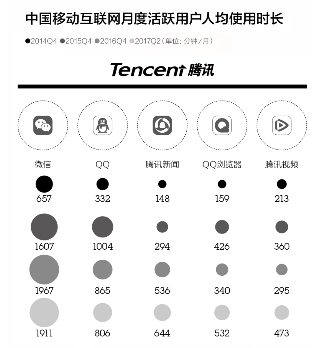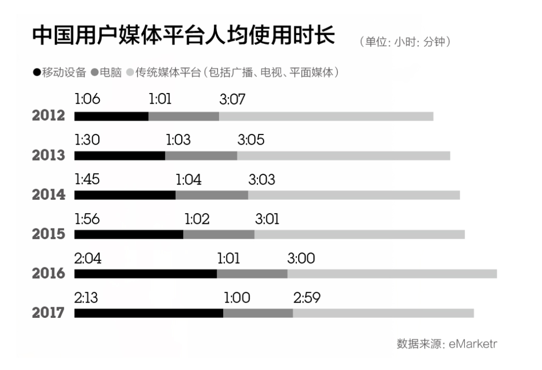 在西方有Facebook、Instagram、Pinterest、Netflix,在中国有微信、微博、今日头条、优酷、知乎、网易……都抢着为你服务,给你推送消息,填塞你可能空下来的时间。2017年,中国人均花费在数字媒体上的时间达到3小时14分钟,而在5年前,这个数字才刚2个小时出头,其中花费在移动端的时间为2小时13分,花费在桌面端的时间为1小时。我们在手机上用去的时间已经与我们在电视上所用去的时间等量齐观。后者为了达到今天的数字用掉了半个世纪的时间,而智能手机诞生至今不过十余年。智能手机是迄今为止技术产业创造的规模最大的市场,与上一个时代的家用PC领域对比,PC是以家庭为单位使用,而智能手机是以个人为单位使用,后者的数量是前者的3倍以上。