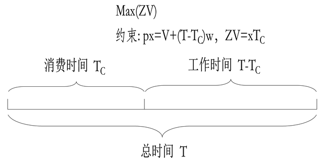 公式左边是是消费品数量x和价格p的乘积,右边是其他收入V和工资收入之和,其中T表示总时间,TC表示用于消费的时间,(T-TC)表示工作时间,w表示工资。而家庭效用函数ZV是消费品x和消费时间TC的乘积,即ZV=xTC,从广义动量定理的角度说,消费品就是力量F,消费时间对应于时间t,而成果nmV对应ZV,就是消费品x在时间TC上的积累效应。增加工作时间可以增加报酬(T-TC)w,进而增加消费品数量x,但是会减少消费时间TC;反过来,减少工作时间可以减少报酬(T-TC)w,进而减少消费品数量x,但是会增加消费时间TC。为了追求ZV= xTC的最大值,必定会存在一个最优时间值TC,使得家庭效用ZV获得最大值(如图2-20所示)。