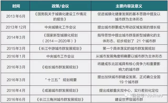 城市群概念并非近几年才出现,从“十一五”起,我国各类规划均有提及发挥城市群对区域发展的辐射作用。不过,在此期间的城市群多半停留在形态建设,而没有实质发展。在新型城镇化框架下,2013年底召开的城镇化工作会议明确提出城市群要成为带动区域发展的增长极。2014年国务院颁布的《国家新型城镇化规划(2014-2020)》、2016年中央城市工作会议和“十三五”规划纲要相继提出并强调以城市群为主体形态,在沿海地区建设京津冀、长三角、珠三角等三个世界级的城市群,在中西部地区建设若干个区域性城市群,以促进区域均衡发展。与此同时,在2015年4月长江中游城市群发展规划印发之后,2016年上半年发改委密集发布了哈长城市群、成渝城市群、长江三角洲城市群发展规划,全国城市群规划正在加速推进。