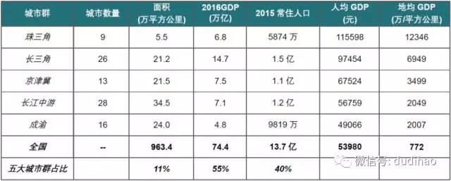从经济规模来看,占国土面积11%的五大城市群经济总量占全国55%,是中国经济最活跃、潜力最突出的地区。2016年,长三角、京津冀与珠三角三大传统城市群GDP规模分别为14.7、7.5和6.8万亿,人均GDP分别为9.7、6.8和11.6万元,无论是经济总量还是人均效益,三大传统城市群都处于领先水平,也仍将是未来中国经济发展的领头羊。其中京津冀城市群规划规格高、政策执行力度大,表明京津冀将呈现追赶之势,与长、珠三角城市群的差距将缩小。长江中游和成渝城市群GDP规模分别为7.1和4.8万亿,长江中游城市群常住人口达1.2亿,成渝城市群也接近1亿人,虽然人均效益仍与发达城市群相差较远,但其依然是国内产业转移的主要承接地,也是带动整个中西部崛起的核心,未来增长空间较大。