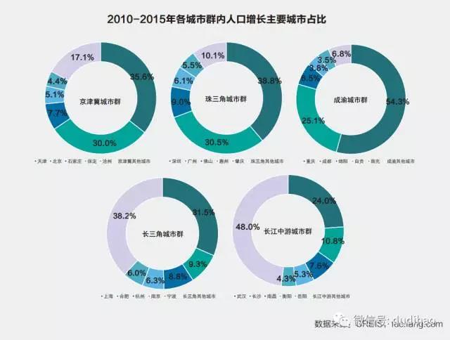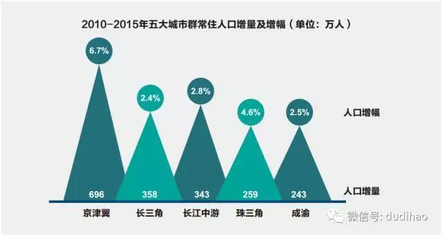 从人口增量来看,京津冀城市群受益于北京、天津两大城市人口的快速增长,五年常住人口增加近700万,人口凝聚力居首;珠三角城市虽然面临制造业向内陆转移的压力,但2015年人口规模相对2010年仍增长4.6%,人口吸引力突出。