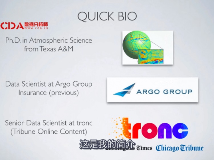 Jesse steinweg - woods即将成为tronc的一名资深数据科学家,致力于文章的推荐系统和理解客户行为。此前,他在Argo Group Insurance工作,主要利用机器学习技术采用了新的定价模型。他在德克萨斯A&M大学获得了大气科学博士学位,他研究领域是数值天气和气候预测。