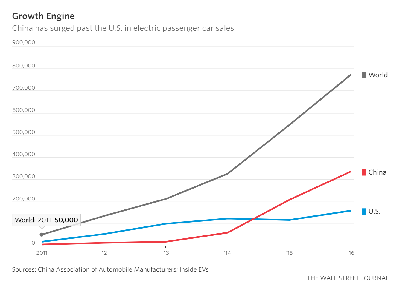 Already, Chinese-made models dominate. More than 100 electric models are on the domestic market. Sales of plug-in passenger vehicles reached 351,000 in 2016—nearly half the global total, according to EV-Volumes, a research group that tracks electric-car sales.