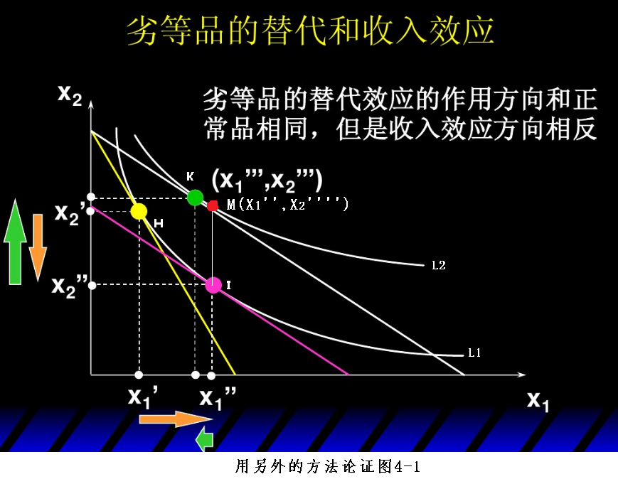 基于此图4-1中两条平行的消费者预算线可以看出I点和K点的斜率是相等的,而K点却又处于I点的左上方。根据我们上一节中所推导出的同族无差异曲线之间的特征规律可以知道:L2这条无差异曲线根本就不可能是无差异曲线L1的同族无差异曲线,那么这两条曲线中必定有一条曲线是不可能存在的。这两位著名的经济学家之所以会犯这种错误,就是因为他们没有遵循同族无差异曲线之间的特征规律。