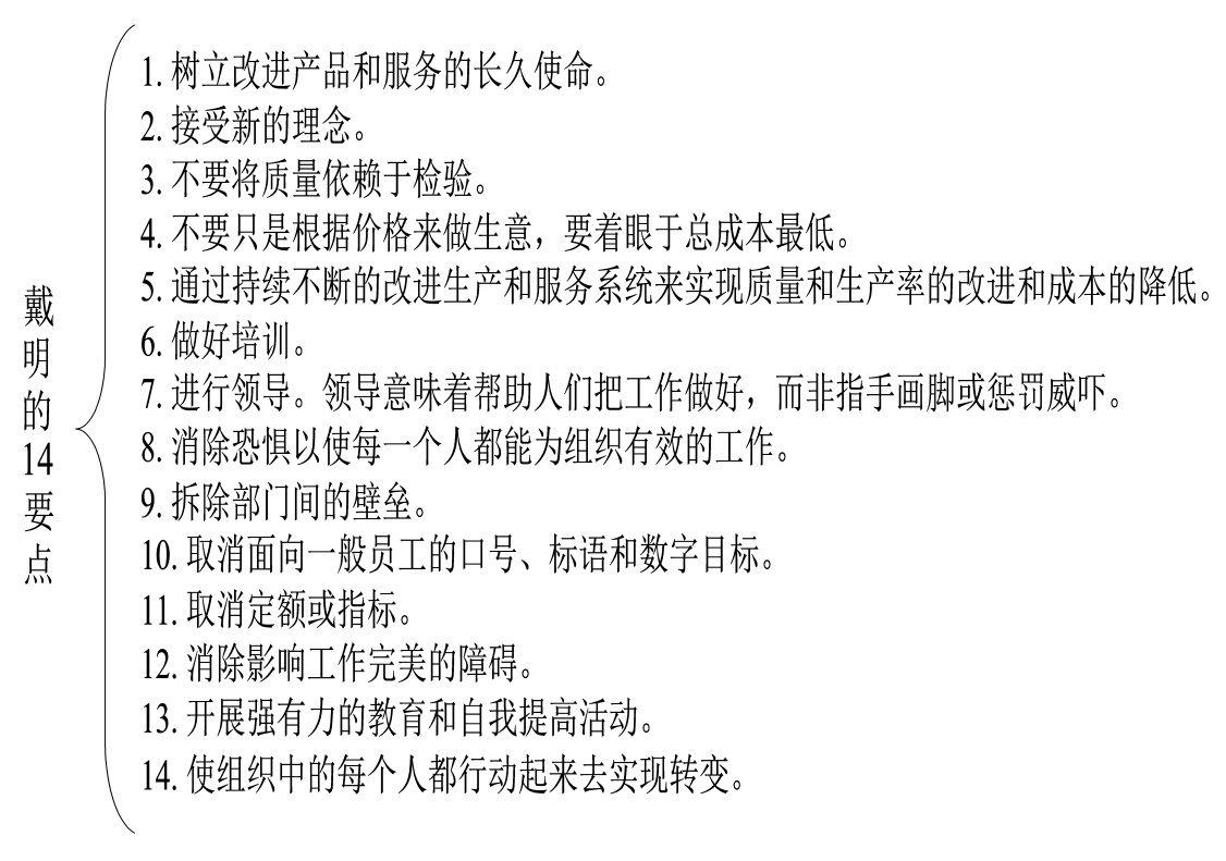 内容提要:戴明是一个质量管理专家,他提出了戴明十四要点和发展了PDCA环。PDCA包括Plan(计划)、Do(执行)、Check(检查)和Action(纠正),PDCA循环就它按照这样的顺序进行质量管理,并且循环不止地进行下去的科学程序。1950年,戴明对日本工业振兴提出了“以较低的价格和较好的质量占领市场”的战略思想。许多质量管理专家认为,戴明的理论帮助日本从一个衰退的工业国转变成了世界经济强国。戴明的管理可以总结为14要点(如图2-22所示)。