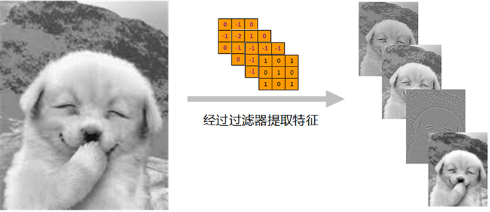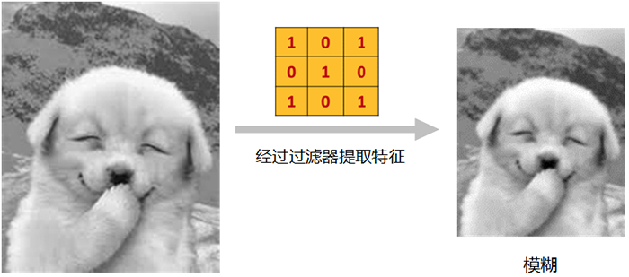仍以这张萌狗为例,它经过“过滤器”提取特征后,得到的是一张……哦,好吧……看起来有点儿模糊的图。