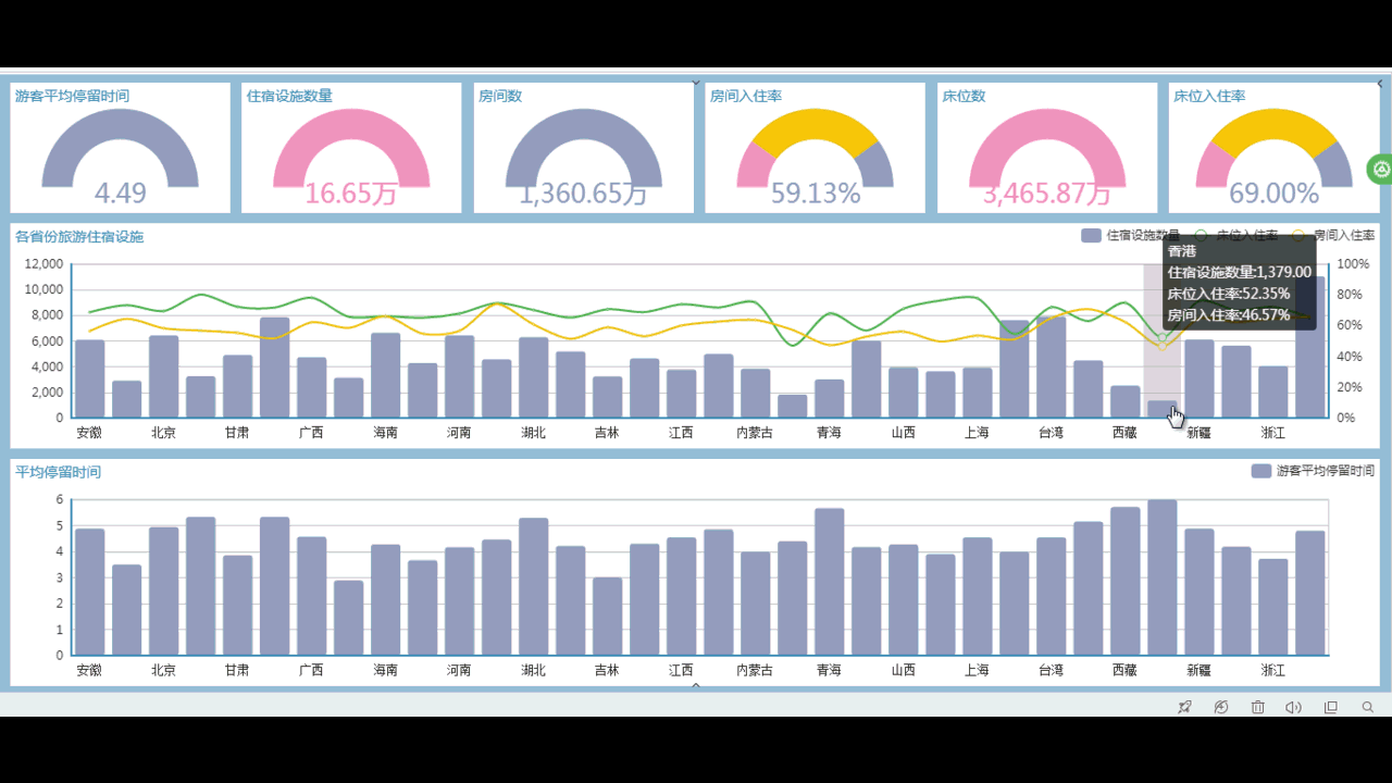 总结:通过鼠标移动可以看到中间图像各省份指标的具体情况。通过鼠标点击可以与下方的平均停留时间进行共鸣,方便查看对应省份的平均停留时间。