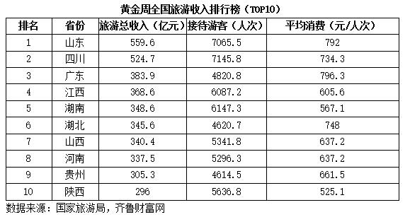 分省份来看,热点省份、热点城市旅游持续火爆。湖南省共接待游客6147.32万人次,同比增长22.71%;实现旅游收入348.64亿元,同比增长29.46%。贵州省共接待游客4614.54万人次,同比增长42.10%;实现旅游收入305.27亿元,同比增长43.52%。陕西省共接待游客5636.82万人次,同比增长7.4%;实现旅游收入296亿元,同比增长11.64%。值得注意的是,齐鲁财富网研究中心通过对全国十一黄金周旅游收入进行排名,结果发现实现旅游收入最多的是山东省,达到559.6亿元,四川紧随其后,达到524.7亿元,遥遥领先第三名广东省(383.9亿元)。作为山东人,笔者感到骄傲和自豪。具体来看,据山东省旅游发展委、省统计局联合统计调查测算,2017年“国庆·中秋”旅游黄金周,全省共接待游客7065.5万人次,增长14.0%;实现旅游消费总额559.6亿元,增长16.1%。据统计调查,2017年“国庆·中秋”旅游黄金周,全省纳入监测的百家景区共接待游客1502.1万人次,增长12.3%;实现门票收入5.85亿元,增长13.8%。