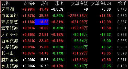 随着黄金周热度的逐步降温,前期表现突出的景点旅游板块在长假结束后的第一个交易日表现较差,降温效应明显。截至目前,属于该板块的24只个股,只有天目湖实现涨停。另外,保持红盘的个股也仅有8只而已。节后两天来,整个板块一直保持大幅回调的态势。就目前而言,齐鲁财富网研究中心认为,整体旅游板块热点效应已然褪去,投资者需谨慎操作,切莫追高。