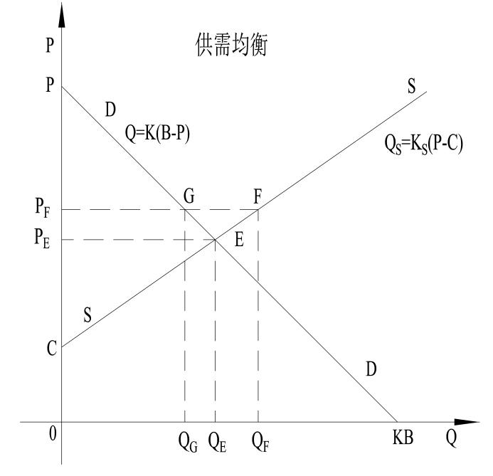 在一个竞争的市场中,所有的需求者和供给者均是商品价值的接受者,每个人的需求量和供给量的变化不会影响商品的相对价值B,即商品的价值B是恒定的,那么需求曲线是一条向上倾斜的直线,需求曲线为Q=K(B-P)。而如果供给者的成本C是固定的,那么供给曲线的公式为QS=KS(P-C)。供需均衡是两条线段的交点E。下图为供需均衡的简化版本(如图3-11所示)。