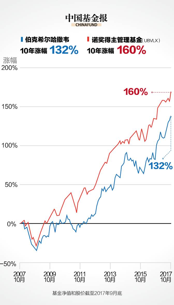 依据其公司网站的数据,该基金的近10年的累计收益率有159.93%,而同期巴菲特执掌的伯克希尔的涨幅只有131.93%。