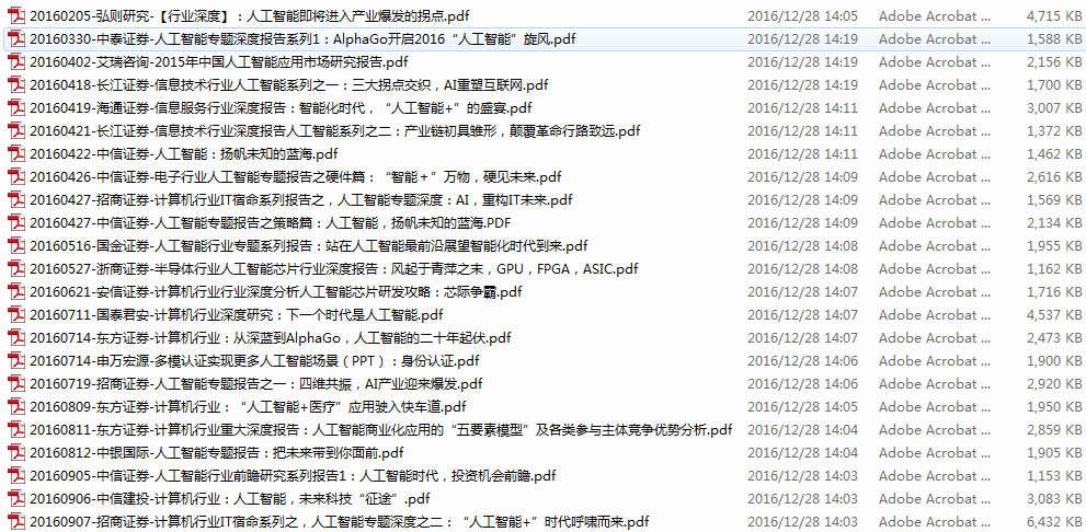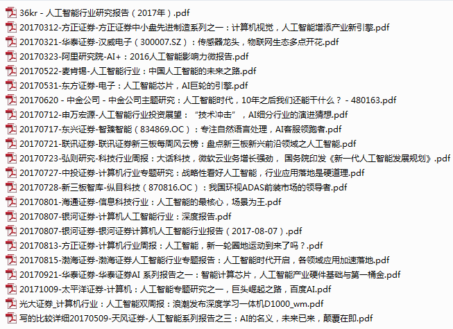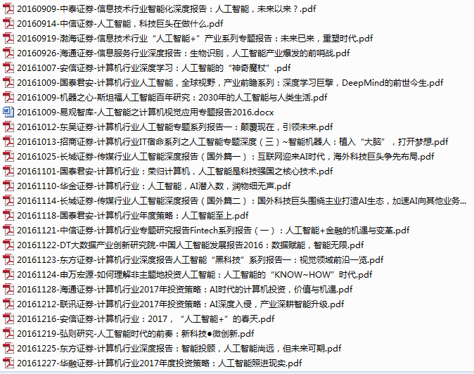 目前,人工智能是科技界的前沿技术,也是资本市场热捧的热点投资领域,本资源汇集了2016年和2017年各大券商和研究机构针对人工智能的研究报告,里面详细描述了人工智能的技术原理、基础应用、以及AI+不同行业的产业前景,对于人工智能感兴趣的坛友可以一睹为快!