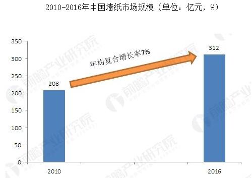 因此,我们将墙纸行业产品平均价格设定在150元/卷左右来对墙纸行业的市场规模进行测算,通过测算,2016年我国墙纸行业市场规模在312亿元左右,2010-2016年的年均复合增长率在7%左右。