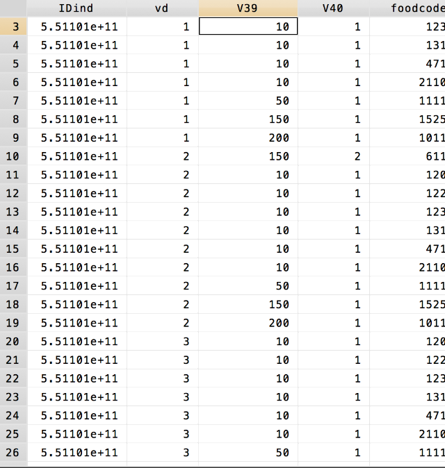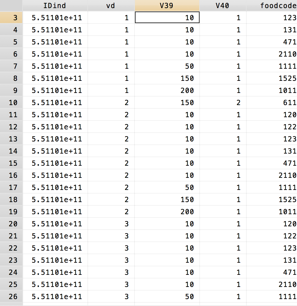 IDind是每个人的id,vd是调查的天数1,2,3天,v39是食物的克数,foodcode是食物编码,食物编码我可以查食物成分表把同类的食物分类,但是因为CHNS数据的每个人每天的食物克数是分开为3天的,并且同一天一个人吃的不同的食物的克数都是横向的,请问下大家处理过这个数据的时候都是怎么处理的哇、??