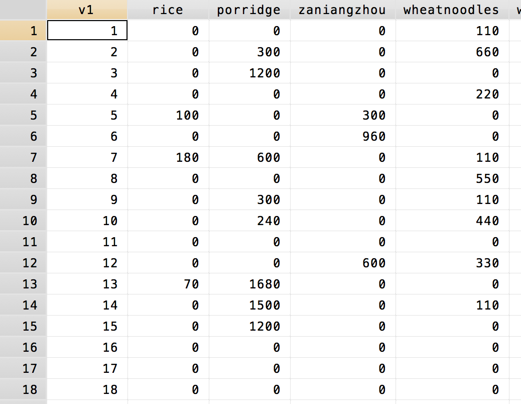 v1是被调查者的编号,纵列是分别每天平均所吃食物的克数