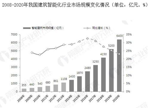 建筑智能化工程行业市场前瞻与投资规划分析报告》预计,2016-2020年,我国建筑智能化市场规模继续保持30%左右的增长,到2020年或可达6400亿元。