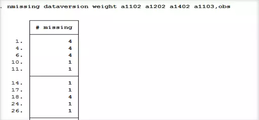 命令nmissing它不仅可以查看变量的缺失情况,还可以查看观测的缺失情况。运行命令nmissing和选项obs就可以看到每条观测值的缺失值的个数。例如,我们想看一下所有的观测值在这6个变量dataversion weight a1102 a1202 a1402a1103的缺失情况,运行命令后,在这6个变量中有缺失值的观测会在结果窗口中显示出来,缺失值的个数也会一同显示。运行命令及结果如下图所示: