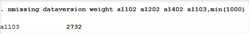 选项min(#)可以显示缺失值个数超过#的变量及其缺失值情况。例如,如果我们想看一下这6个变量dataversion weight a1102 a1202 a1402a1103中有没有变量的缺失值的个数大于1000,运行命令及结果如下图所示: