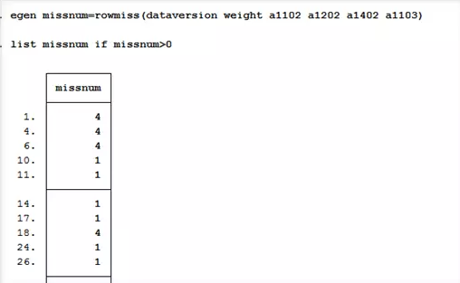 我们还可以通过另一种方法查看观测的缺失情况-命令egen,rowmiss(varlist)。运行命令及结果如下图所示: