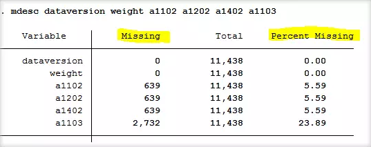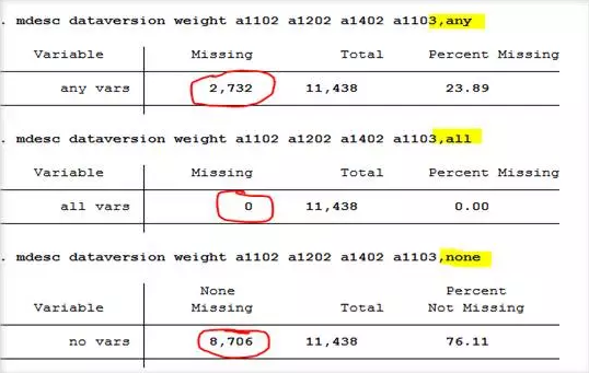 命令mdesc一共有4个选项,其中,选项any、all和none可以限定不同条件查看观测在指定变量串中的缺失情况。我们还是以这6个变量dataversion weight a1102 a1202 a1402a1103为例,运行命令及结果如下图所示: