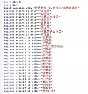 首先,以CGSS2015数据中的地理信息变量为标准,参照国家统计局发布的2015年统计用区划代码和城乡划分代码,整理出一套编码模板。编码模板共分为5个部分,分别针对省/自治区/直辖市、地级市、县/区、乡/镇/街道、村/居委会进行编码,模板命令长达1200多行。下图所示为变量s41省/自治区/直辖市的编码模板命令: