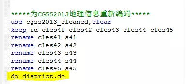 我们可以将编码模板命令单独编写在一个do文件中,给该do文件命名为district,如果需要在CGSS2013数据中运行编码模板命令,直接运行do文件即可。如下图所示: